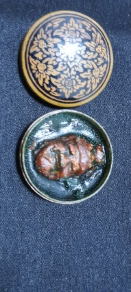 ตลับสีผึ้งเก่าทองเหลืองลงยาไม่ทราบที่ครับ เคาะเดียวแดง |