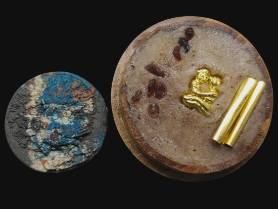 เคาะเดียวแดง พญายูงคำ รุ่นแรก เนื้อเกสรทั้งห้า และ ตลับไม้สีผึ้งเนื้อหอม รังผึ้งร้าง ขวางเดือนขวางตะวัน รุ่นแรก ฝังอิ่น ตะกรุด ในเมตตาบารมี เจ้าปู่จั่นต่า กาวิสาละ ครูบากฤษดา เมตตาเษก |