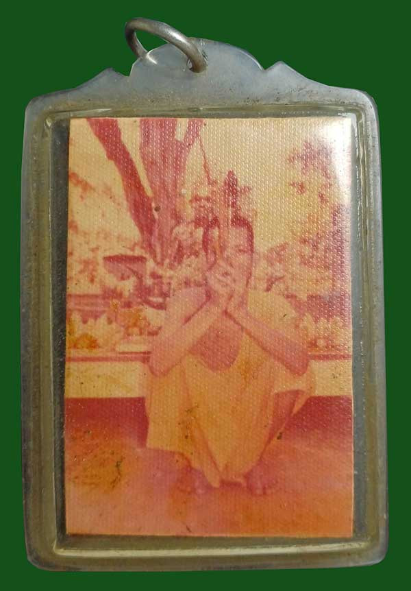 รูปถ่ายกระดาษหนังไก่ ขนาด 2.5 x 3.5 ซ.ม. ด้านหลังบรรจุผง เกศา จีวร เลื่ยมเดิม เก่าไม่ทราบเกจิ |