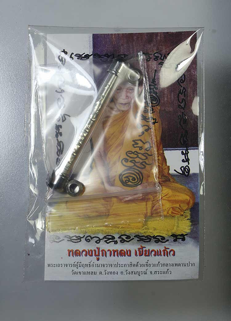 ตะกรุดลูกอม หลวงพ่อหยอด วัดแก้วเจริญ เนื้อเงิน ตอกโค๊ตภาษาจีน |