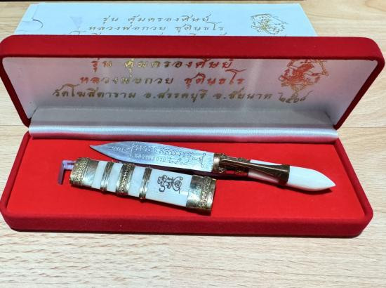 หลวงปู่ฝั้น ปสาโท วัดศรีถมอรัตน์ (หน้าผา) อ.ศรีเทพ จ.เพชรบูรณ์ ศิษย์พุทธาคมสายตรง หลวงพ่อทบ , หลวงพ่อเขียน , หลวงพ่อเดิม , หลวงพ่อกัน , หลวงพ่อกวย มีดหมอ วาระ 8 รอบ ยาวประมาณ 5 นิ้ว รวมด้าม |