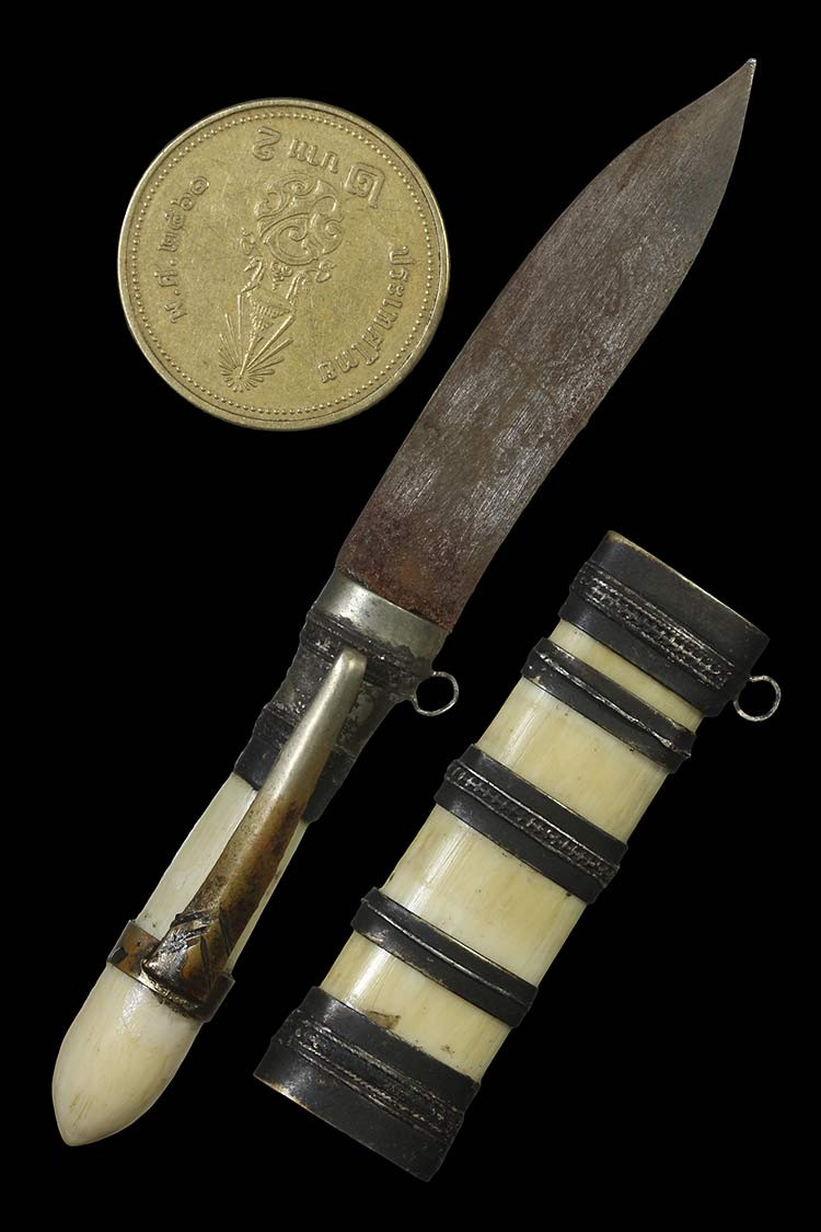 วัดใจ**เครื่องราง มีดหมอสาริกา*{ ด้ามงา+ฝักงาเนื้องาแกะ+มีรอยจาร }*รัดด้วยแหมเงินเก่า ยาว 3.5นิ้ว สภาพสมบูรณ์....เดิมๆครับ |