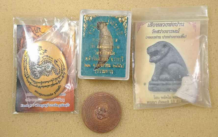 ล็อกเก็ตเสือ พระครูสมุห์ บรรเจิด + เขี้ยวเสือ หลวงพ่อหวล วัดชาวเหนือ ราชบุรี + เหรียญบารมี 30 ทัศน์ หลวงพ่อศรีนวล วัดเพลง จ.นนทบุรี + เสือผงหลวงพ่อปาน วัดคลองด่าน |