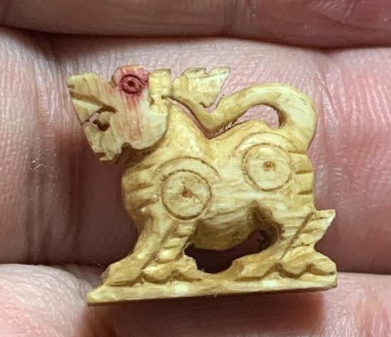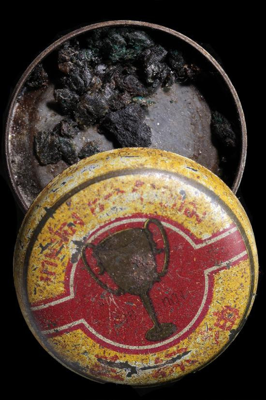 **ตลับสีผึ้งทองเหลืองโบราณพร้อมสิงห์สามขวัญเนื้องาแกะเก่า** |
