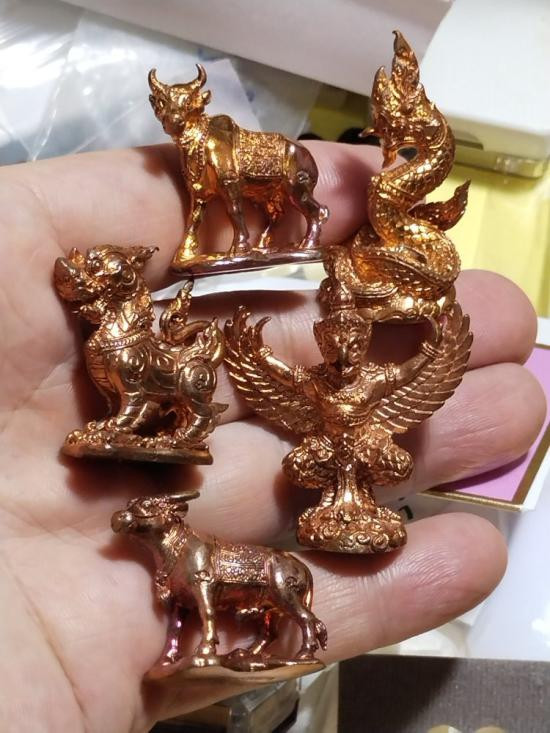 พญาครุฑสุบรรณราช,พญานาคทิพยภุชงค์ ,สิงห์สีหราช,โคอุสุภราช,กระบือทิพยกาสร สัตว์ทรงเทวดานพเคราะห์ประจำวันเกิด หลวงพ่อพร วัดป่าธรรมโสภณ จ.ลพบุรี เนื้อทองแดงรวม5องค์ |