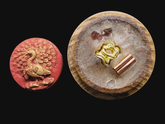 เคาะเดียวแดง พญายูงคำ รุ่นแรก เนื้อแดงปัดทอง และ ตลับไม้สีผึ้งเนื้อหอม รังผึ้งร้าง ขวางเดือนขวางตะวัน รุ่นแรก ฝังอิ่น ตะกรุด ในเมตตาบารมี เจ้าปู่จั่นต่า กาวิสาละ ครูบากฤษดา เมตตาเษก |