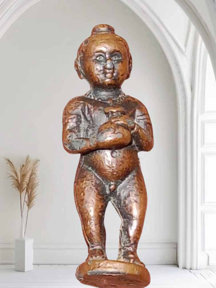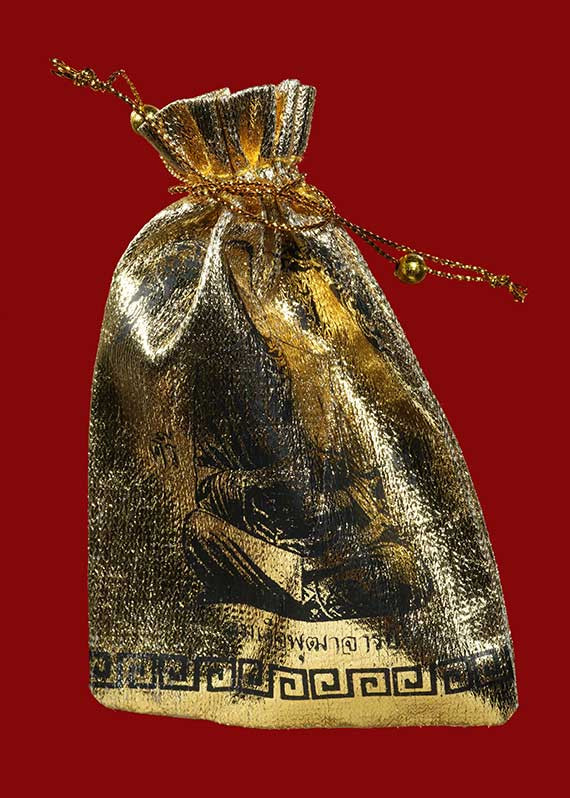 กุมารทอง ถือถุงเงินเนื้อตะกั่วอาบทองแดง ใช้มาเก่า ๆ บางที่ตีเป็นของล พ.กวย |