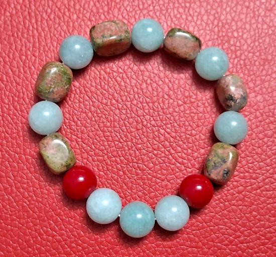 ประคำข้อมือหินปะการังแดง ขนาด 10 มิล+หินอความารีน ขนาด 10 มิล +หินยูนาไคต์ แบบเหลี่ยม (หินถูกหวย) หินแท้ 100 % ร้อยด้วยเอ็นยืด ขนาดฟรีไซด์ (กท.87) |