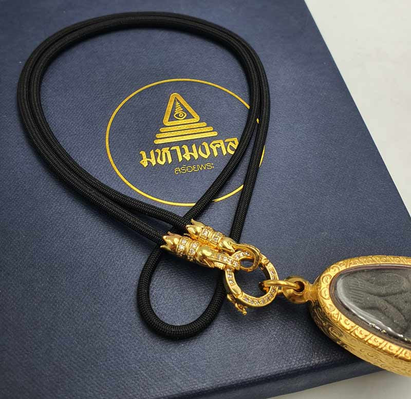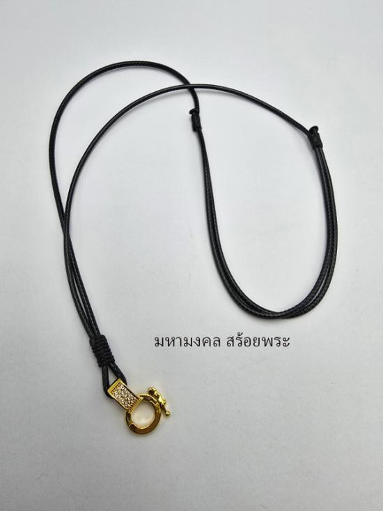 สร้อยเชือกร่มแต่งด้วย ปี๊เซียะทองเลเซอร์ พร้อมก้ามปูสปริง สำหรับแขวนพระ 2 องค์ ยาว 24 นิ้ว |
