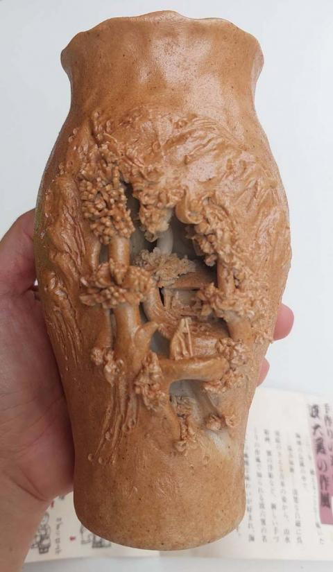 แจกันดินเผาแกะสลักลายนูนต่ำ ศิลปะสไตล์ญี่ปุ่น ขนาดกว้าง 10 สูง 17 ซม. |