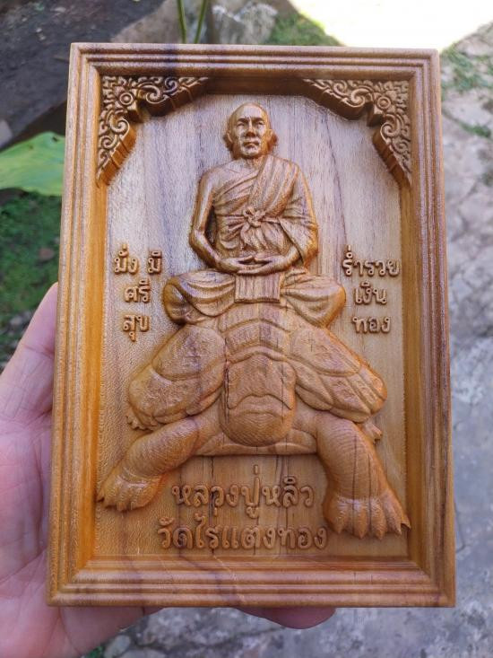 200. หลวงพ่อทองสุข ไม้สักแกะสลักมงคลกว้าง14ซม.สูง20ซม.หนา2.5ซม.+ขาตั้ง |