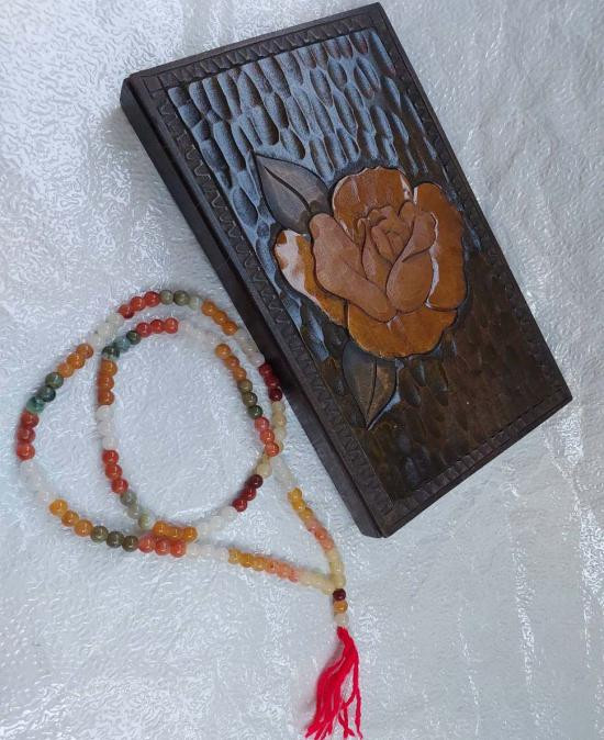 ***วัดใจ***กล่องไม้วินเทจญี่ปุ่น งานฝีมือเก่าแกะลายญี่ปุ่น พร้อมสร้อยประคำหินหยก 5 สี 108 เม็ด ขนาด 9 มิล |