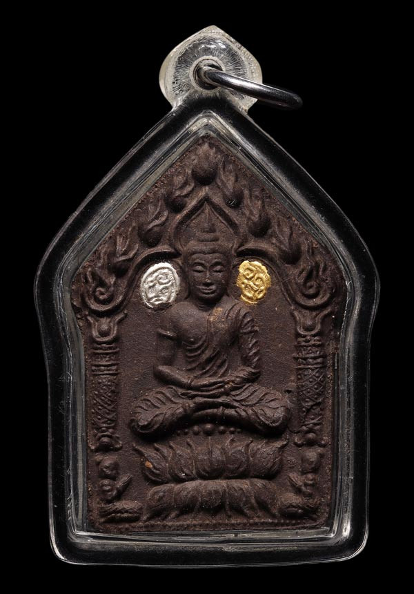 เหรียญเสมาฉลุ บงกชบูรพา หลวงปู่บัว เนื้อนวะลงยา ตระกรุดทองคำ |