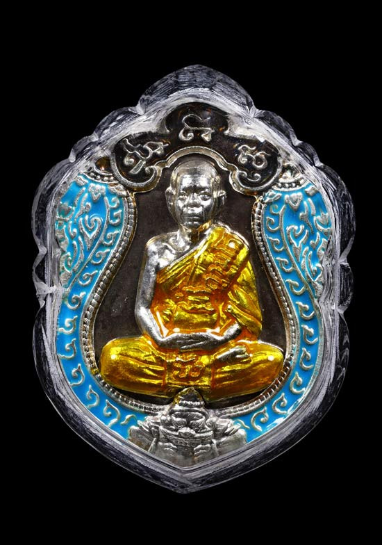 ***เหรียญหลวงปู่บัว เสมาเจ็ดรอบ เนื้อนวะหน้าเงินลงยา ปี 2553 จ.ตราด หมายเลข 328*** |
