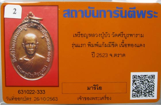 เหรียญหลวงปู่บัว วัดศรีบูรพาราม จ.ตราด รุ่น3 เนื้อทองแดง ห่วงเดิม ปี2534 จ.ตราด + บัตรG-pra สภาพสวยเดิมค่ะ |