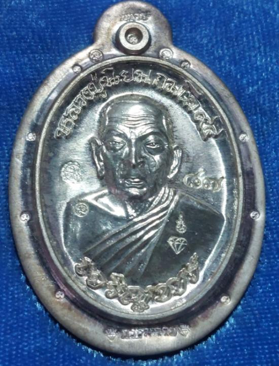 เหรียญเจริญพรเมตตามหานิยม หลวงปู่นิยม กมโล เนื้อเงินไม่ตัดปีก หลังแบบ ๙รอบ กรรมการ no ๘๗ วัดแจ้งนอก ปี 2555 |