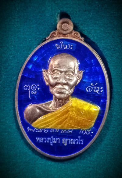 เหรียญหลวงปู่มา ญาณวโร วัดสันติวิเวก ร้อยเอ็ด งานยกยอดฉัตรเจดีย์ เนื้อเงินลงยาสีน้ำเงิน หมายเลข 55 ท่านเป็นศิษยฺเอกอาวุโสของหลวงพ่อเต๋ คงทอง วัดสามง่าม นครปฐม |