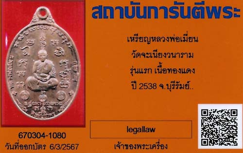 วัดใจ40 เหรียญปู่หลาน หลวงปู่จื่อ วัดเขาตะเงาะอุดมพร จ.ชัยภูมิ รุ่นแรก เนื้อทองแดง ปี 2530 |