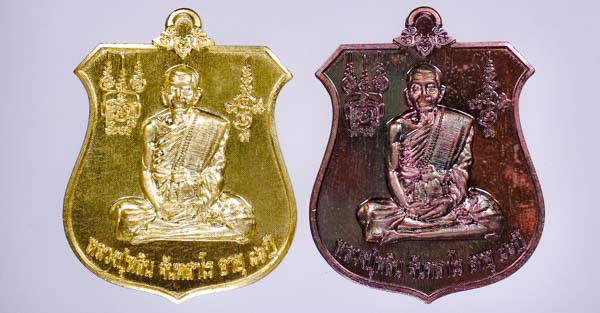 เสือรุ่นแรก หลวงปู่ศิลา สิริจันโท เนื้อทองแดงนอกชุปพิงค์โกล์พ่นทรายขัดเงา พิมพ์เล็ก ซีลเดิม ซีลเดิม ( 3 ) |