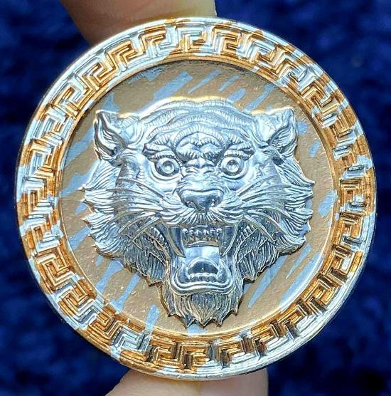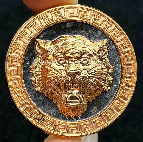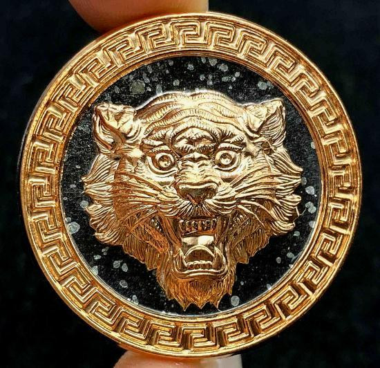 เหรียญโชคดี พญาเสือนอนกิน รุ่นแรก พระอาจารย์ประสูติ (หลวงพ่อประสูติ) วัดในเตา จ.ตรัง เนื้อทองทิพย์ลงยาแดง หน้ากากเสือโลหะอาถรรพ์ เลข 19 |