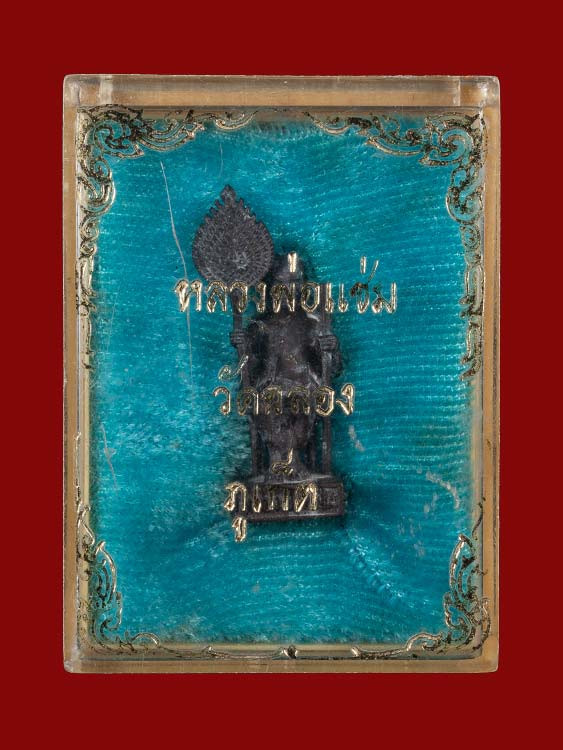 พระกริ่งหลวงพ่อแช่มวัดฉลอง รุ่นแขนทลุ เนื้อทองเหลือง ปี 2541 จังหวัดภูเก็ต พร้อมกล่องเดิมจากวัด |