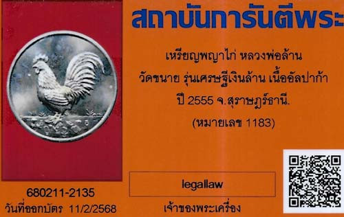 เหรียญพญาไก่รวยทรัพย์ พ่อหลวงล้าน วัดขนาย รุ่นเศรษฐีเงินล้าน ๕๕ สุราษฎร์ สวยกริ๊บ*85 |