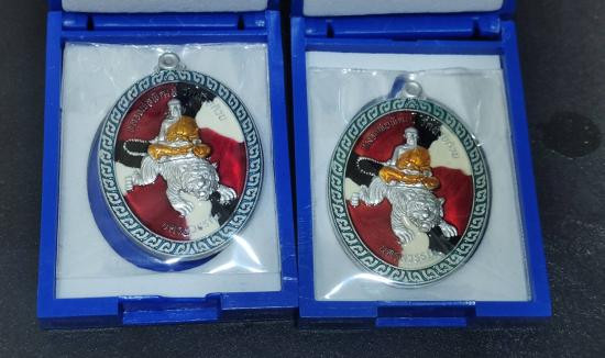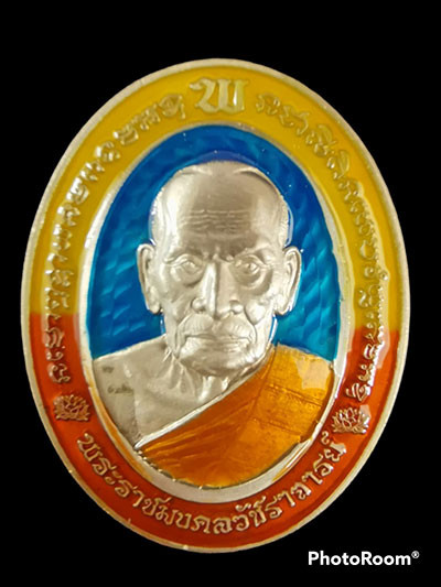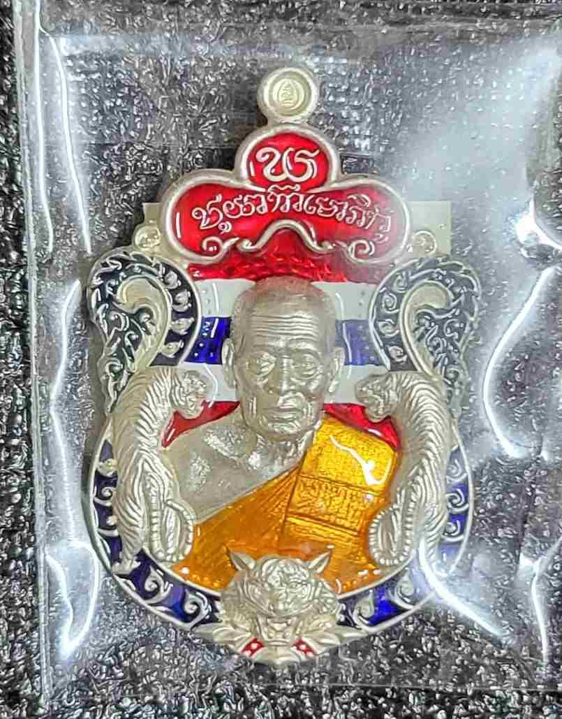 งูกินหางเนื้ออัลปาก้า ลงยาฟ้า ลงยาขอบเหลืองส้ม ลงยาจีวร รุ่นเจ้าสัวเศรษฐีบารมีปุญญกาโม หลวงพ่อพัฒน์ วัดห้วยด้วน |