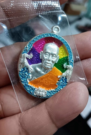 งูกินหางเนื้ออัลปาก้า ลงยาฟ้ม่วง ลงยาขอบชมพู ลงยาจีวร รุ่นเจ้าสัวเศรษฐีบารมีปุญญกาโม หลวงพ่อพัฒน์ วัดห้วยด้วน |