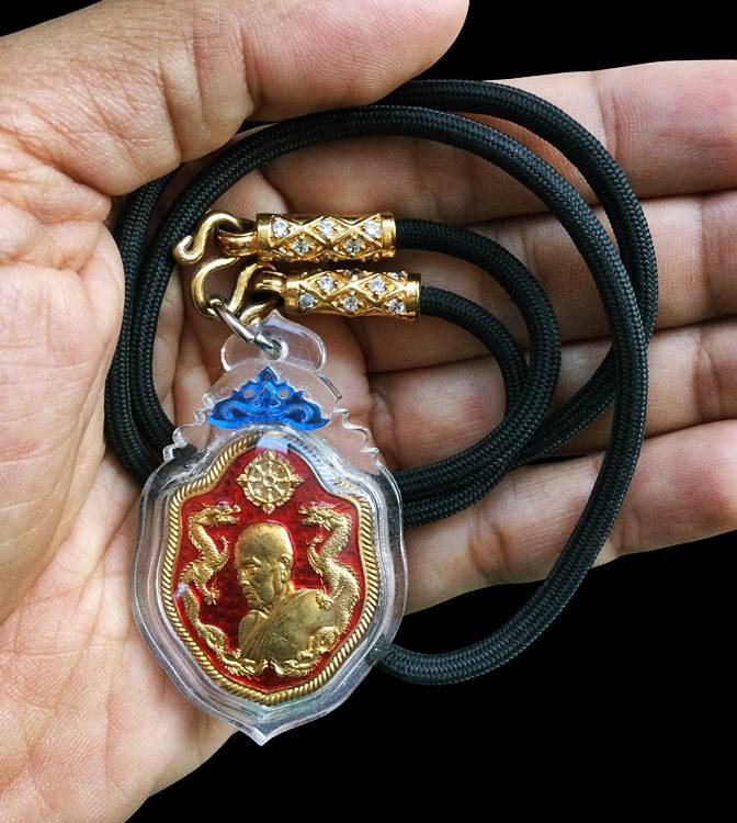 พี่ยักษ์ทองทิพย์ด้านหลังเป็นหลวงปู่ดู่ พรหมปัญโญเนื้อว่านผสมมวลสารผงจักพรรดิ จารและอธิฐานจิตโดยหลวงตาม้า วัดถ้ำเมืองนะเลี่ยมจากวัดพร้อมประคำ |