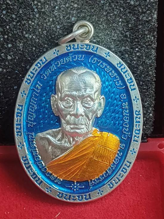 เหรียญหลวงพ่อพัฒน์ วัดห้วยด้วน "รุ่นราชาพยัคฆ์ปี" 2563 เนื้อเงินลายเสือ ลงยาน้ำเงิน ลงยาจีวร เลขสวย |