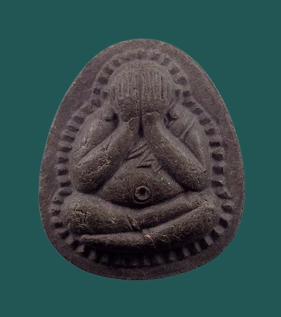 พระปิดตาปุ้มปุ้ย หลวงปู่ม่น วัดเนินตามาก จ.ชลบุรี เนื้อว่านใบลานผสมเส้นเกศา หลังโรยพลอย |
