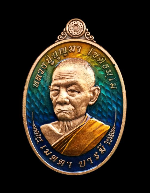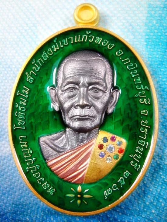 เหรียญรุ่นบารมีหนุนดวง เนื้อชุบ 4K ลงยาจีวร จีวรฝังเพชร CZ นพเก้า (เพชร 9 เม็ด) ลงยาสีเขียว ด้านหลัง พิเภกลงยาเครื่องทรง หลวงปู่บุญมา โชติธมโม สำนักสงฆ์เขาแก้วทอง (---A84---) |