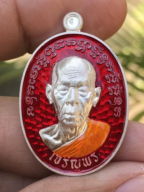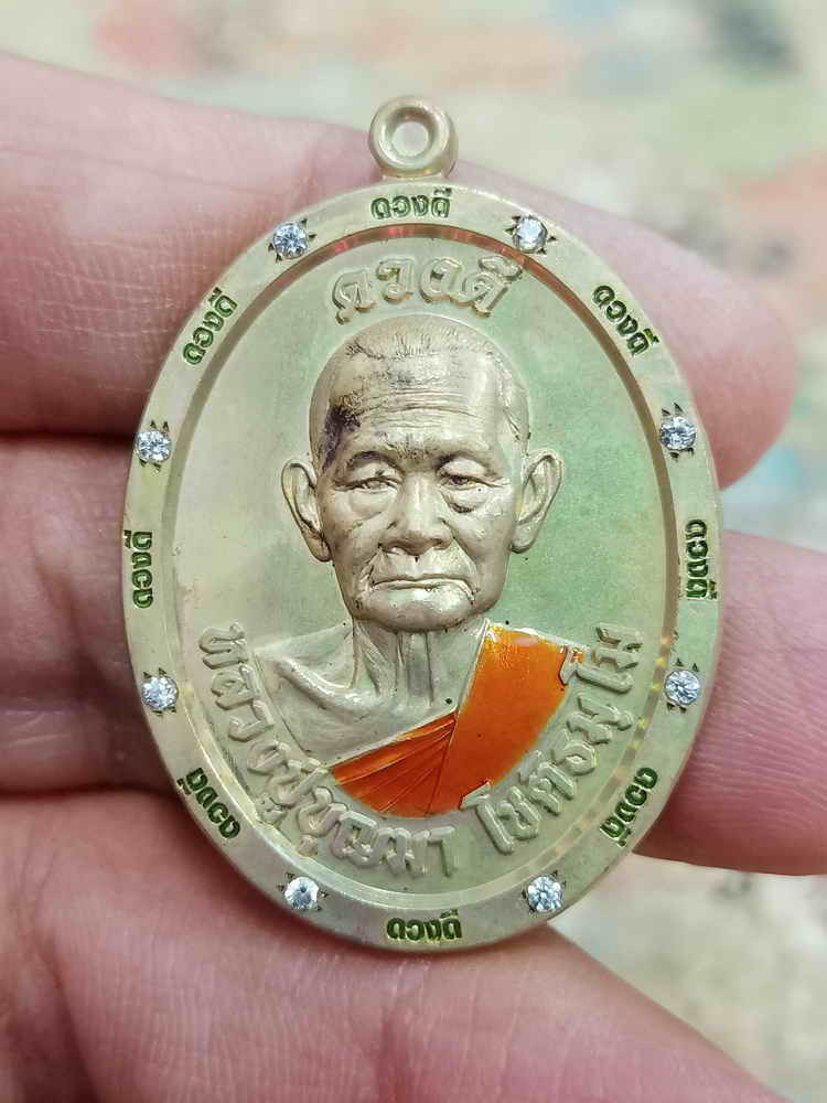 หรียญรุ่นเจริญพรหันข้าง เนื้อชุบเงินลงยาพื้นสีขมพู ลงยาจีวร ฝังเพชร CZ หลวงปู่บุญมา โชติธมโม สำนักสงฆ์เขาแก้วทอง (---A82---) |