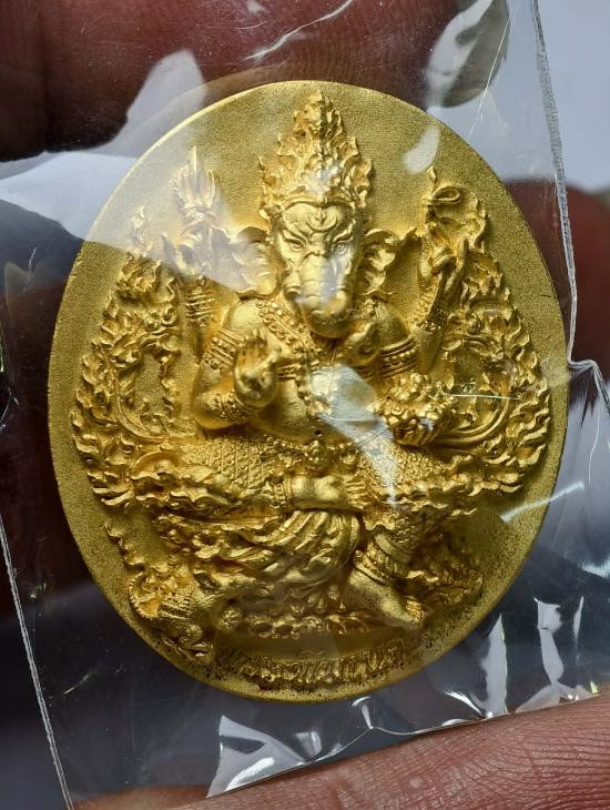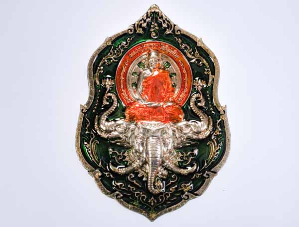 เหรียญรุ่นประทานพร เนื้ออัลปาก้าลงยาพื้นเขียว ลงยาประทานพรขอบ ลงยาจีวร หลังลงยาเครื่องทรง พระพิฆเนศ หลวงปู่บุญมา โชติธมโม สำนักสงฆ์เขาแก้วทอง (---A81---) |