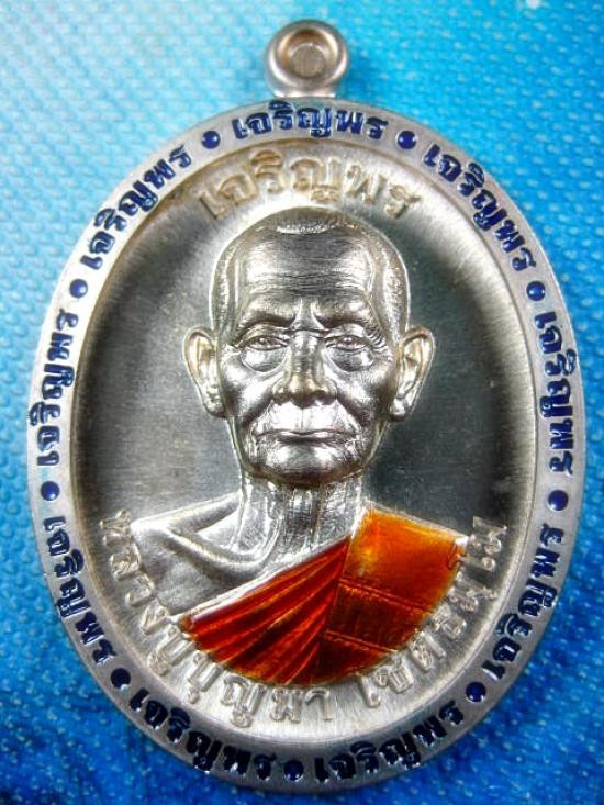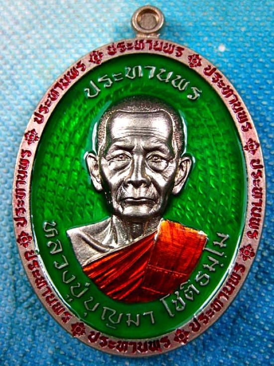 เหรียญรุ่นเจริญพร 7 รอบ เนื้ออัลปาก้าลงยา ตัวหนังสือขอบเจริญพรสีน้ำเงิน ลงยาจีวร หลวงปู่บุญมา โชติธมโม สำนักสงฆ์เขาแก้วทอง (---A83---) |