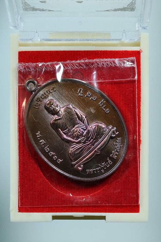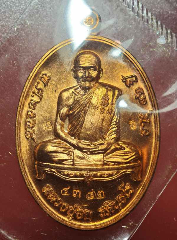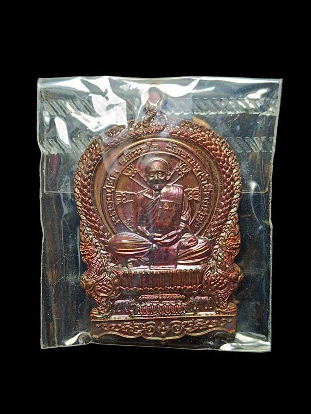 เหรียญนั่งพานสำเภาทอง หลวงปู่ฮก วัดราษฏร์เรืองสุข จ.ชลบุรี ปี 2558 (เนื้อทองแดงรมมันปู) ตอกโค้ต หมายเลข 2138 ซีลเดิม พร้อมกล่อง ผิวสวยๆ