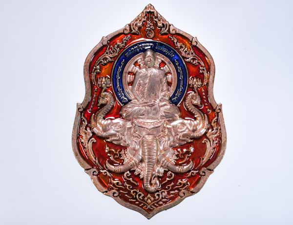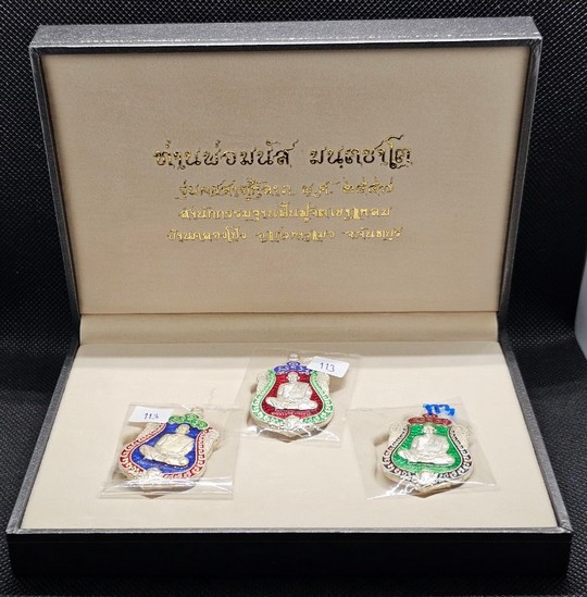 เหรียญเสมา รุ่นคชสารให้ลาภ ชุดเนื้อเงินลงยา 3เหรียญ หมายเลข ๑๑๓ หลวงพ่อมนัส มนฺตชาโต สำนักกรรมฐานฟื้นฟูจิตเขาแหลม บ้านคลองโป่ง จันทบุรี