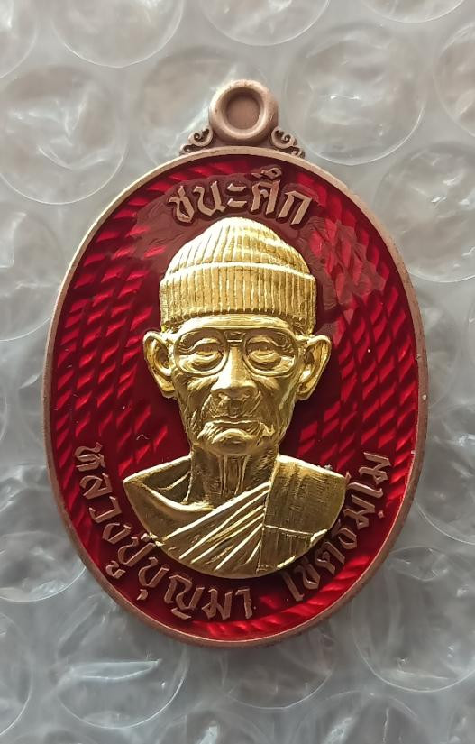 เหรียญชนะศึก หลวงปู่บุญมา สำนักสงฆ์เขาแก้วทอง จ.ปราจีนบุรี เนื้อทองแดงซาตินหน้ากากชุบทอง ชุดนำฤกษ์ย
