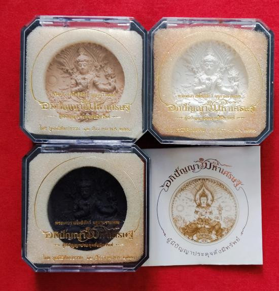 กราบขออนุญาตท่านอ.เฉลิมชัย โฆษิตพิพัฒน์ นำเสนอ อภิปัญญามหาเศรษฐี พิมพ์เล็ก ขนาด 3.5 ซม. เนื้อผงพุทธคุณ 1 ชุด สามสี พร้อมกล่องเดิม มีปลอกขาวครบ |
