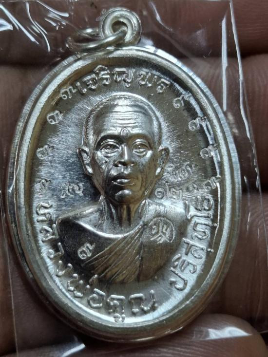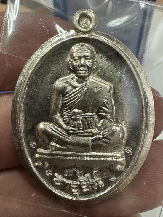 วัดใจ เหรียญนั่งพาน รุ่น " อายุยืน " หลวงพ่อคูณ วัดบ้านไร่ เนื้อเงิน (ไม่ตัดปีก) จำนวนสร้างน้อยเพียง 99 เหรียญ สภาพสวย พิเศษสร้างจากเนื้อเงิน "โฟร์ไนน์ 99.99%" เนื้อหนักเงิน 19.8 กรัม |
