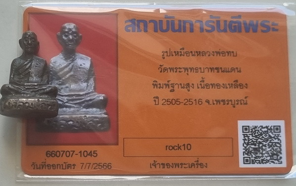 รูปเหมือนหลวงพ่อทบ วัดพระพุทธบาทชนแดน พิมพ์ฐานสูง ปี2505 เนื้อทองเหลือง จ.เพชรบูรณ์ สภาพสวยมาก มาพร้อมบัตรรับรองจีพระ |