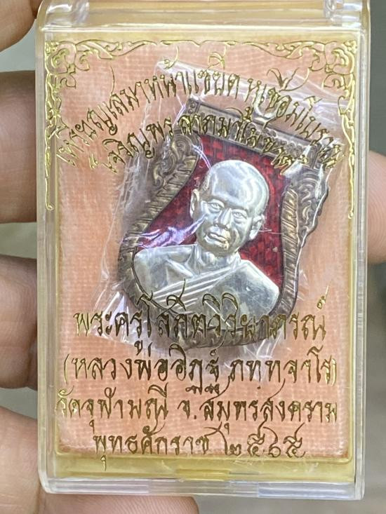 เหรียญเสมาหน้าแซยิดหูเชื่อมโบราณ หลวงพ่ออิฎฐ์ วัดจุฬามณี จ.ส มุทรสงคราม พ.ศ.2565 เนื้อนวะโลหะเต็มสูตรลงยาแดงหน้าเงินลงยา เลข 2390 กล่อง |