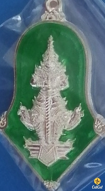 เหรียญท้าวเวสสุวรรณ พิมพ์ทรงจำปี รุ่น เทวาประทานทรัพย์สินเจริญดี หลวงพ่ออิฏฐ์ วัดจุฬามณี อุปถัมถ์ (ขนาดเหรียญสูง 4 ซม.) เนื้อเงินลงยาเขียว หลังลงยาแดง |