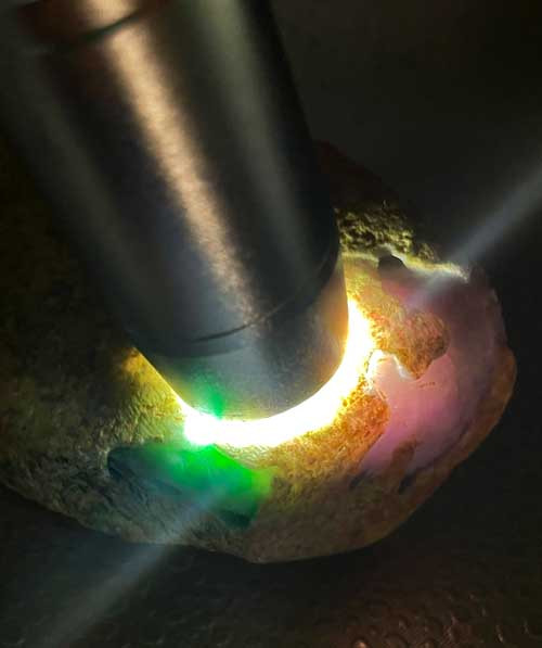 ก้อนหยกดิบจากพม่า เจาะเอาเปือกเนื้อออก ส่องด้วยไฟแรงสูง มีสีเขียว และ ม่วงออกชมพู น้ำหนัก 452.7กรัม |