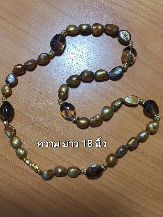 สร้อยไข่มุกน้ำจืดร้อยคั่นด้วยหินใสสีอำพันเหลืองยาว 18นิ้ว |