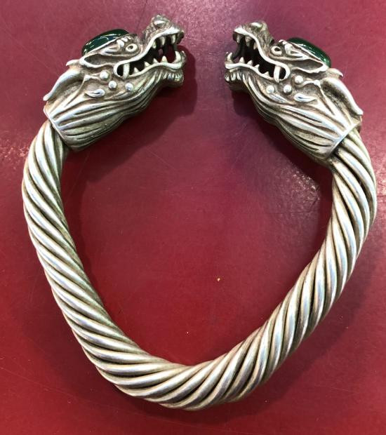 กำไรหัวพญานาคคู่เนื้อกลั่ยเงินหนาหัวหยกสีเขียวเก่า |