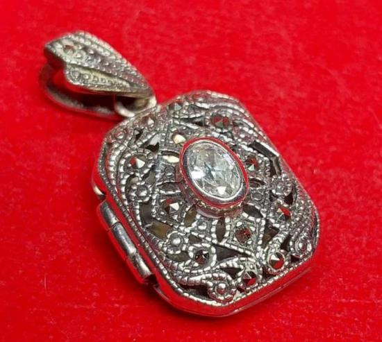 จี้ล็อคเก็ตสไตล์วิกตอเรียนทำจากเงินแท้ ประดับมาร์คาไซต์และหินใสตรงกลาง |