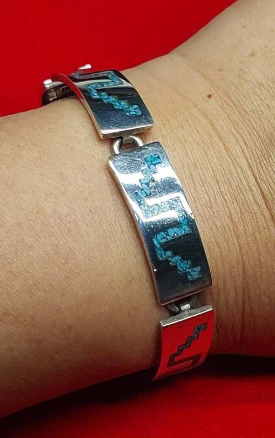 เลสข้อมือวินเทจเม็กซิกันประดับหินเทอร์ควอยซ์จากเมืองทักซ์โก ยาว 18 cm. |