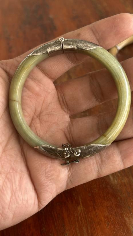 กำไลหยก จับเงินหนาๆแกะลาย ของเก่าเก็บ(สวยสมบูรณ์) |