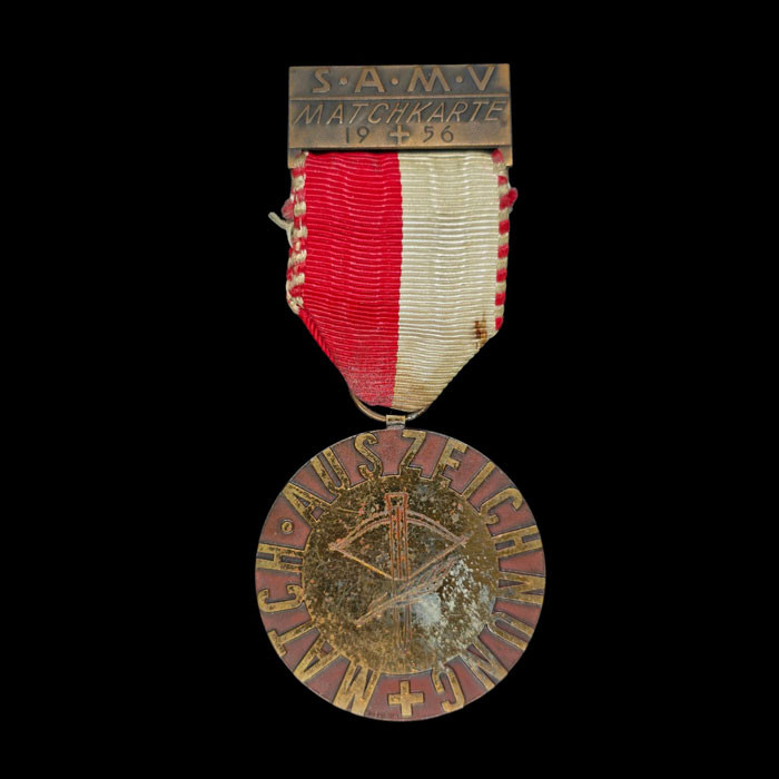 เหรียญรางวัลในภาพคือเหรียญที่ระลึกที่มอบให้ในการแข่งขันยิงหน้าไม้ ซึ่งจัดขึ้นในปี 1956 โดยสมาคมยิงปืนและยิงหน้าไม้แห่งสวิส (Schweizerischer Armbrustschützenverband หรือ S.A.M.V.) |